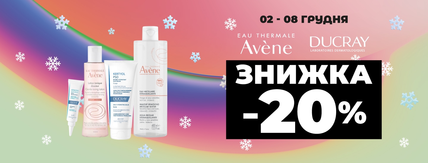 *Акція діє з 02.12.2025 по 08.12.2025 в магазинах Watsons за адресою: м.Київ вул. Гната Юри 20, м. Львів вул. Вагова 2, м. Київ вул. Павла Скоропадського 5А, м. Біла Церква вул. Ярослава Мудрого 40, м. Львів вул. Патона 37, м. Луцьк вул. Сухомлинського 1, м. Київ вул. Ірпінська 76, м. Київ вул. Мишуги 4, м. Київ вул.Площа Спортивна 1А та на сайті www.watsons.ua. Знижка 20% надається на обраний асортимент продукції ТМ AVENE, DUCRAY. Інформацію про співвідношення розміру нової ціни до попередньої ціни реалізації товару або про розмір знижки та деталі дізнавайтесь у консультантів в мережі магазинів Watsons та на сайті www.watsons.ua, або за телефоном 0 800 300 333. Вартість дзвінків згідно з тарифами вашого оператора зв’язку.