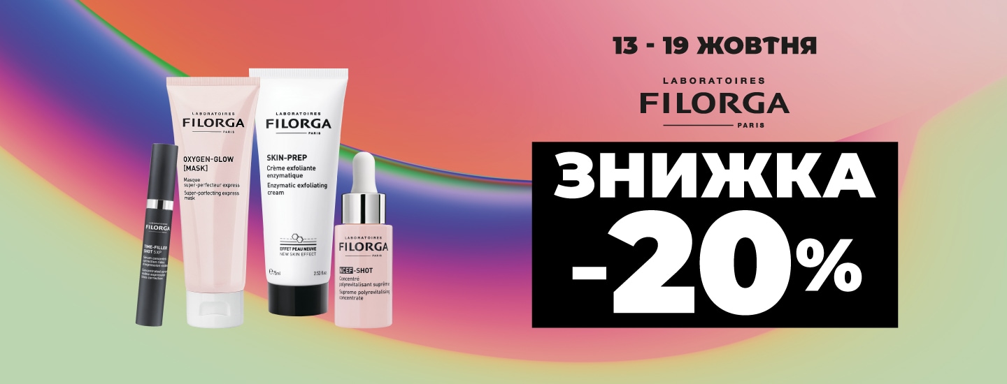 *Акція діє з 13.10.2025 по 19.10.2025 в магазинах Watsons за адресою: м.Київ вул. Гната Юри 20, м. Львів вул. Вагова 2, м. Київ вул. Павла Скоропадського 5А, м. Біла Церква вул. Ярослава Мудрого 40, м. Львів вул. Патона 37, м. Луцьк вул. Сухомлинського 1, м. Київ вул. Ірпінська 76, м. Київ вул. Мишуги 4, м. Київ вул.Площа Спортивна 1А та на сайті www.watsons.ua. Знижка 20% надається на обраний асортимент продукції ТМ FILORGA. Інформацію про співвідношення розміру нової ціни до попередньої ціни реалізації товару або про розмір знижки та деталі дізнавайтесь у консультантів в мережі магазинів Watsons та на сайті www.watsons.ua, або за телефоном 0 800 300 333. Вартість дзвінків згідно з тарифами вашого оператора зв’язку.