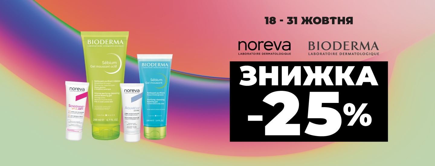 *Акція діє з 18.10.2025 по 31.10.2025 в магазинах Watsons за адресою: м.Київ вул. Гната Юри 20, м. Львів вул. Вагова 2, м. Київ вул. Павла Скоропадського 5А, м. Біла Церква вул. Ярослава Мудрого 40, м. Львів вул. Патона 37, м. Луцьк вул. Сухомлинського 1, м. Київ вул. Ірпінська 76, м. Київ вул. Мишуги 4, м. Київ вул.Площа Спортивна 1А та на сайті www.watsons.ua. Знижка 25% надається на обраний асортимент продукції ТМ NOREVA, BIODERMA. Інформацію про співвідношення розміру нової ціни до попередньої ціни реалізації товару або про розмір знижки та деталі дізнавайтесь у консультантів в мережі магазинів Watsons та на сайті www.watsons.ua, або за телефоном 0 800 300 333. Вартість дзвінків згідно з тарифами вашого оператора зв’язку.