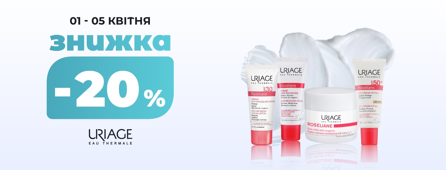 *Акція діє з 01.04.2026 по 05.04.2026 в магазинах Watsons за адресою: м.Київ вул. Гната Юри 20, м. Львів вул. Вагова 2, м. Київ вул. Павла Скоропадського 5А, м. Біла Церква вул. Ярослава Мудрого 40, м. Львів вул. Патона 37, м. Луцьк вул. Сухомлинського 1, м. Київ вул. Ірпінська 76, м. Київ вул. Мишуги 4, м. Київ вул.Площа Спортивна 1А та на сайті www.watsons.ua. Знижка -20% надається на обраний асортимент продукції ТМ URIAGE. Інформацію про співвідношення розміру нової ціни до попередньої ціни реалізації товару або про розмір знижки та деталі дізнавайтесь у консультантів в мережі магазинів Watsons та на сайті www.watsons.ua, або за телефоном 0 800 300 333. Вартість дзвінків згідно з тарифами вашого оператора зв’язку.