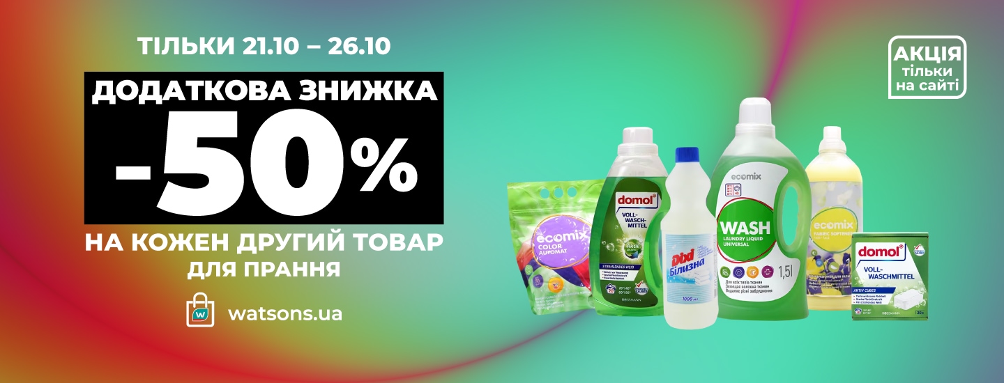 *Акція діє з 21.10.2025 по 26.10.2025 року тільки на веб-сайті www.watsons.ua. Знижка -50% на кожен другий товар надається на весь асортимент товарів для прання. Інформацію про співвідношення розміру нової ціни до попередньої ціни реалізації товару або про розмір знижки, перелік товарів, які беруть участь в акції та деталі дізнавайтеся у консультантів магазинів Watsons, на сайті www.watsons.ua та за телефоном 0 800 300 333. Вартість дзвінків згідно з тарифами вашого оператора зв'язку.