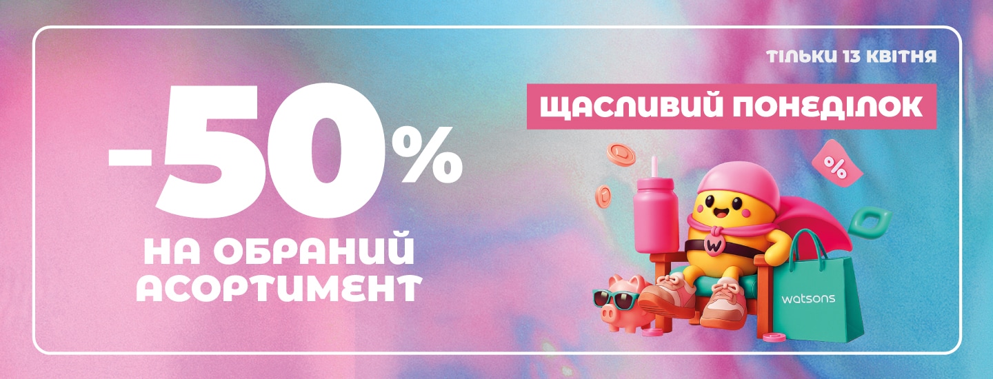 *Акція діє 13.04.2026 року в мережі магазинів Watsons та інтернет-магазині watsons.ua. Знижка -50% надається на обраний асортимент товарів. Інформацію про співвідношення розміру нової ціни до попередньої ціни реалізації товару або про розмір знижки, перелік товарів, які беруть участь в акції та деталі дізнавайтесь у консультантів магазинів Watsons, на сайті watsons.ua та за телефоном 0 800 300 333. Вартість дзвінків згідно з тарифами вашого оператора зв'язку.