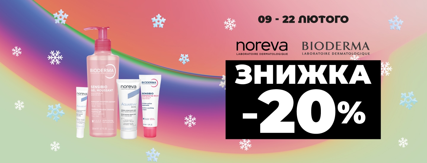 *Акція діє з 09.02.2026 по 22.02.2026 в магазинах Watsons за адресою: м.Київ вул. Гната Юри 20, м. Львів вул. Вагова 2, м. Київ вул. Павла Скоропадського 5А, м. Біла Церква вул. Ярослава Мудрого 40, м. Львів вул. Патона 37, м. Луцьк вул. Сухомлинського 1, м. Київ вул. Ірпінська 76, м. Київ вул. Мишуги 4, м. Київ вул.Площа Спортивна 1А та на сайті www.watsons.ua. Знижка -20% надається на обраний асортимент продукції ТМ BIODERMA, NOREVA. Інформацію про співвідношення розміру нової ціни до попередньої ціни реалізації товару або про розмір знижки та деталі дізнавайтесь у консультантів в мережі магазинів Watsons та на сайті www.watsons.ua, або за телефоном 0 800 300 333. Вартість дзвінків згідно з тарифами вашого оператора зв’язку.