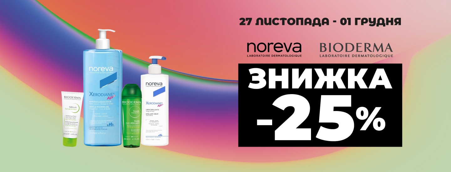 *Акція діє з 27.11.2025 по 01.12.2025 в магазинах Watsons за адресою: м.Київ вул. Гната Юри 20, м. Львів вул. Вагова 2, м. Київ вул. Павла Скоропадського 5А, м. Біла Церква вул. Ярослава Мудрого 40, м. Львів вул. Патона 37, м. Луцьк вул. Сухомлинського 1, м. Київ вул. Ірпінська 76, м. Київ вул. Мишуги 4, м. Київ вул.Площа Спортивна 1А та на сайті www.watsons.ua. Знижка 25% надається на обраний асортимент продукції ТМ NOREVA, BIODERMA. Інформацію про співвідношення розміру нової ціни до попередньої ціни реалізації товару або про розмір знижки та деталі дізнавайтесь у консультантів в мережі магазинів Watsons та на сайті www.watsons.ua, або за телефоном 0 800 300 333. Вартість дзвінків згідно з тарифами вашого оператора зв’язку.