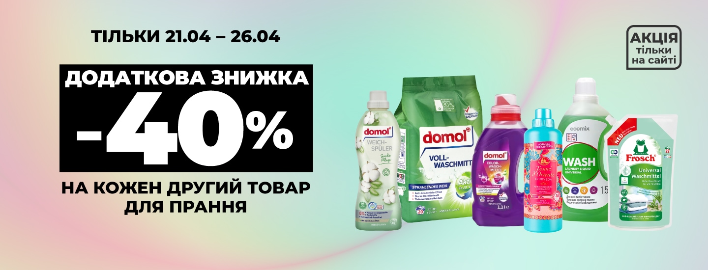 *Акція діє з 21.04.2026 по 26.04.2026 року тільки на веб-сайті www.watsons.ua. Знижка -40% на кожен другий товар на обрані товари для прання. Інформацію про співвідношення розміру нової ціни до попередньої ціни реалізації товару або про розмір знижки, перелік товарів, які беруть участь в акції та деталі дізнавайтеся у консультантів магазинів Watsons, на сайті www.watsons.ua та за телефоном 0 800 300 333. Вартість дзвінків згідно з тарифами вашого оператора зв'язку.