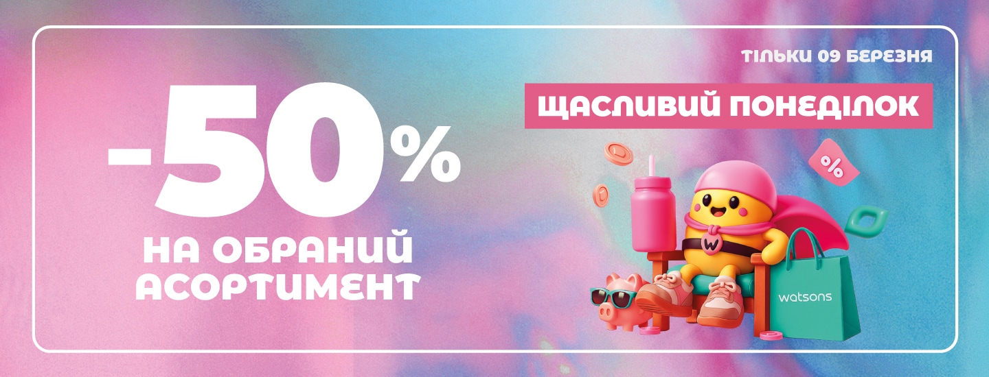*Акція діє 09.03.2026 року в мережі магазинів Watsons та інтернет-магазині watsons.ua. Знижка -50% надається на обраний асортимент товарів. Інформацію про співвідношення розміру нової ціни до попередньої ціни реалізації товару або про розмір знижки, перелік товарів, які беруть участь в акції та деталі дізнавайтесь у консультантів магазинів Watsons, на сайті watsons.ua та за телефоном 0 800 300 333. Вартість дзвінків згідно з тарифами вашого оператора зв'язку.