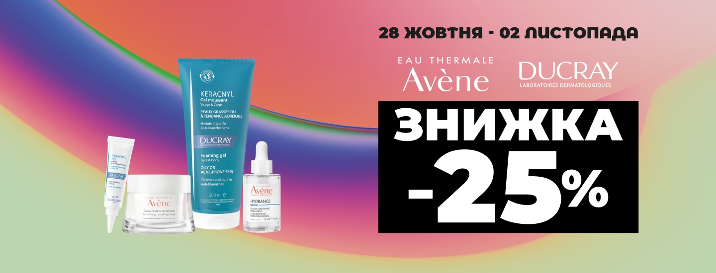 *Акція діє з 28.10.2025 по 02.11.2025 в магазинах Watsons за адресою: м.Київ вул. Гната Юри 20, м. Львів вул. Вагова 2, м. Київ вул. Павла Скоропадського 5А, м. Біла Церква вул. Ярослава Мудрого 40, м. Львів вул. Патона 37, м. Луцьк вул. Сухомлинського 1, м. Київ вул. Ірпінська 76, м. Київ вул. Мишуги 4, м. Київ вул.Площа Спортивна 1А та на сайті www.watsons.ua. Знижка 25% надається на обраний асортимент продукції ТМ AVENE, DUCRAY. Інформацію про співвідношення розміру нової ціни до попередньої ціни реалізації товару або про розмір знижки та деталі дізнавайтесь у консультантів в мережі магазинів Watsons та на сайті www.watsons.ua, або за телефоном 0 800 300 333. Вартість дзвінків згідно з тарифами вашого оператора зв’язку.